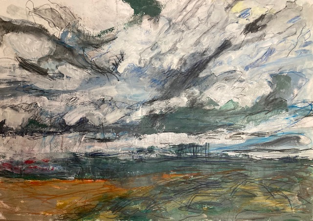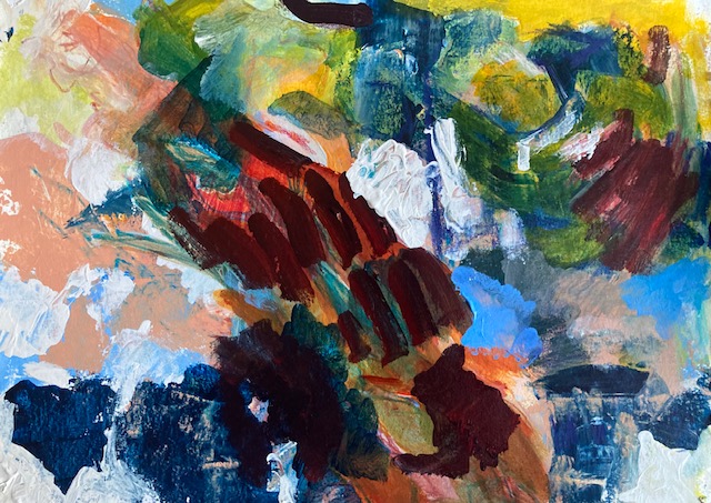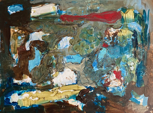 Imaginäre Landkarte. Oder imaginierte Landschaft. Oberflächen von Atollen. Auf und Abtauchendes. Tiefe und Untiefe. Massiv. Atome und Partikel. Gebündeltes und Gestrecktes. Cluster. Klang. Aufgewühltes. Langgezogenes Rot. Was ausrutscht von der Zunge. Zungenbrecher. Umspülendes und Umspültes. Blau. Flecken und Flechten. Surreal. Real. Kartographiertes neben eisigem Weiss. Vernarbtes. Vernähtes. Fäden. Schlingen. Zwischen sich klumpendem Dunkel. Braunes Braun. Ultramarinbraun. Tintiges Blau. Keine Zeit, Signale. Schrapnellspur. Scharf. Kruste. Oben wie. Das Gebirge blaues Braun. Unten. Tiefer. Untiefen. Sich stützend stürzen. Fern Fernes nah. Nach dem Gewordenen. Von Flächen und Furchen. Im Raum Reales.